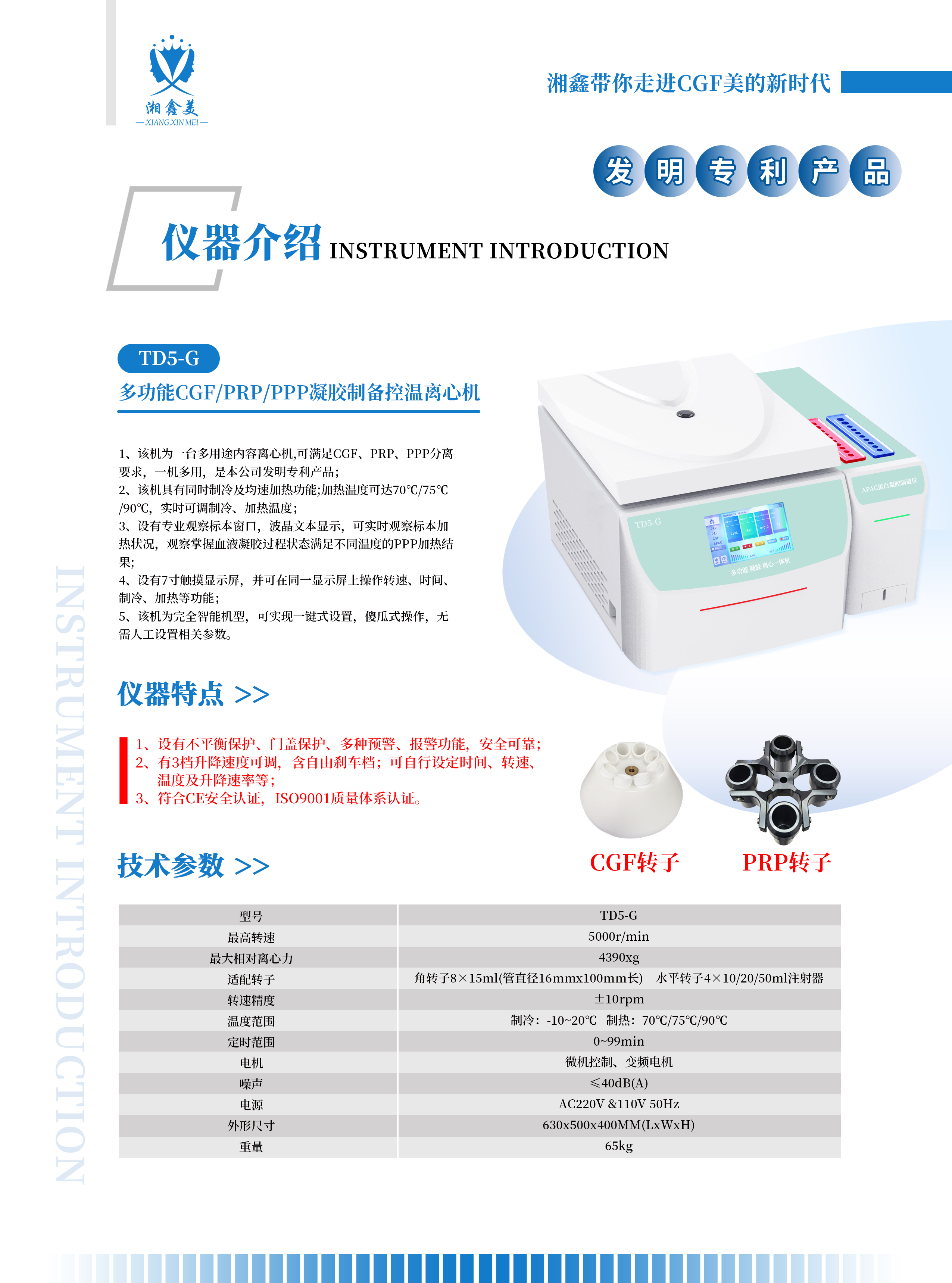 该机为一台多用途内容离心机,可满足CGF、PRP、PPP分离要求,一机多用,是本公司发明专利产品,设有不平衡保护、门盖保护、多种预警、报警功能,安全可靠;有3档升降速度可调,含自由刹车档;可自行设定时间、转速、温度及升降速率等;符合CE安全认证,ISO9001质量体系认证。